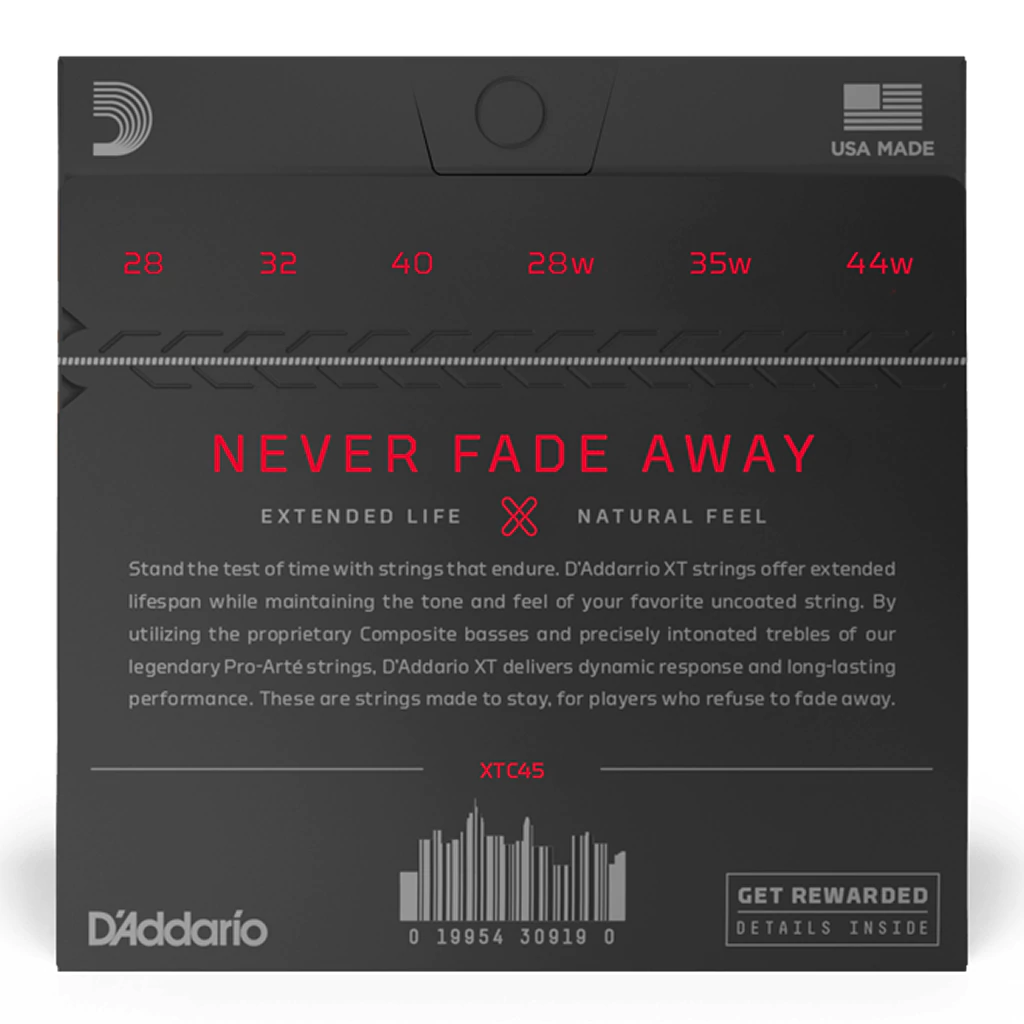 Las XT son nuestras cuerdas clásicas más duraderas, que combinan siglos de experiencia de D'Addario con la moderna tecnología de recubrimiento. Las XT Classical incorporan bajos compuestos, construidos con un núcleo multifilamento de larga duración, recubiertos con cobre plateado y acabados con nuestro recubrimiento XT patentado, para un sonido potente y proyectado, además de una larga vida útil. Se complementan con nuestras cuerdas agudas de nailon Pro-Arté de precisión, que proporcionan la calidez y suavidad que los músicos tradicionales adoran. Este juego de tensión normal es nuestra tensión más vendida, preferida por su equilibrio entre un sonido rico, una sensación cómoda y una proyección dinámica.