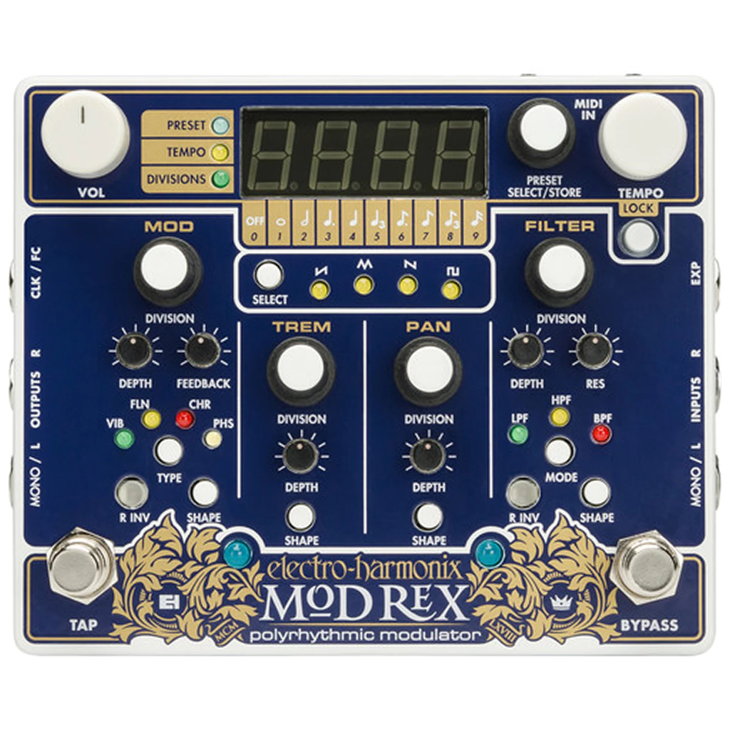 El Electro-Harmonix Mod Rex Polyrhythmic Modulator es una poderosa herramienta creativa diseñada para guitarristas, tecladistas, sintetistas y músicos electrónicos que buscan expandir sus posibilidades sonoras. Su arquitectura se basa en cuatro secciones de modulación independientes y sincronizadas en tiempo, lo que permite crear patrones polirrítmicos complejos, texturas en evolución y movimientos rítmicos totalmente personalizados.