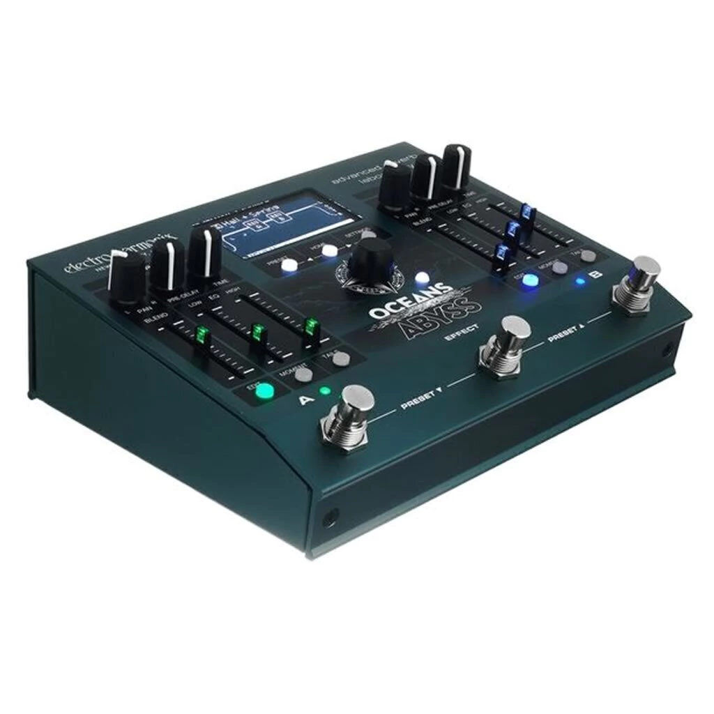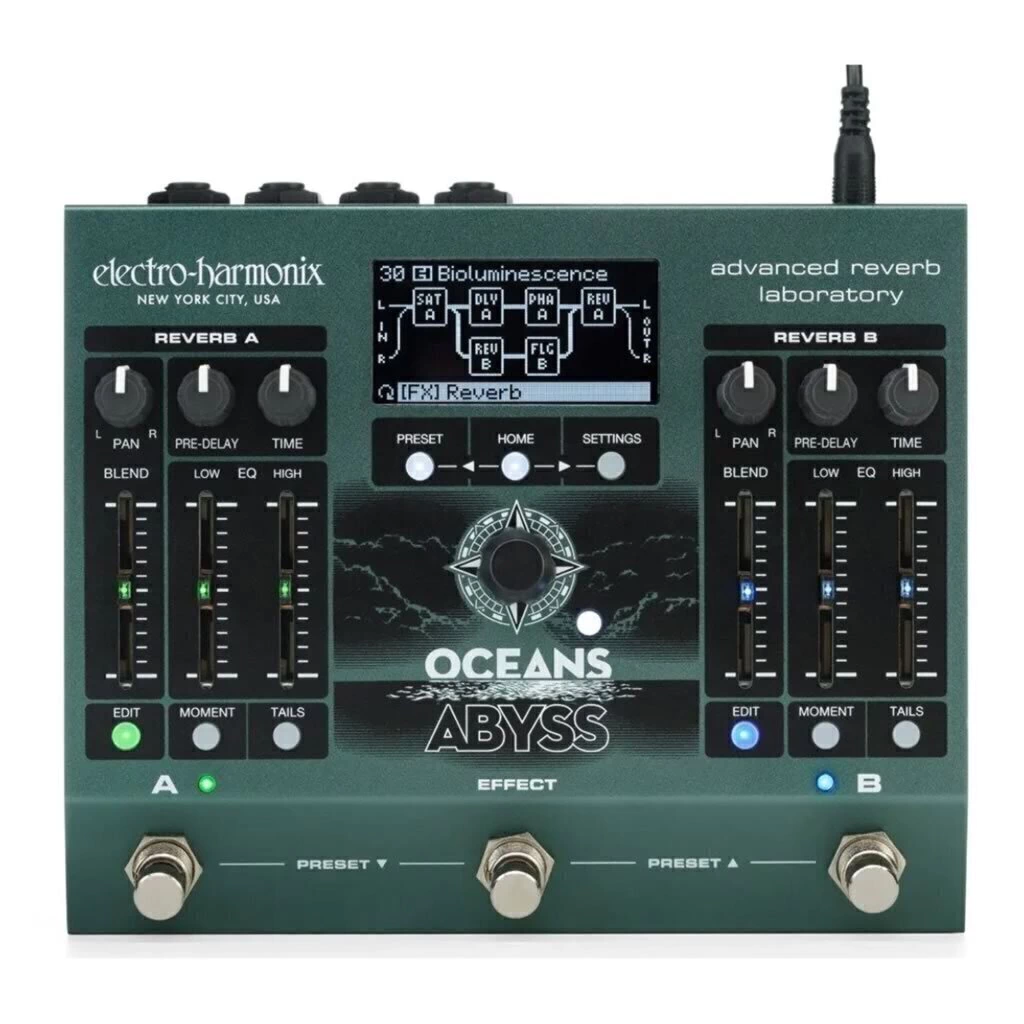 El Electro-Harmonix Oceans Abyss es un laboratorio de reverberación avanzada diseñado para crear paisajes sonoros profundos, expansivos y totalmente personalizados. Equipado con dos motores de reverb estéreo independientes, algoritmos completamente nuevos y la posibilidad de construir cadenas de hasta ocho bloques de efectos, este pedal lleva el diseño sonoro a un nivel profesional.