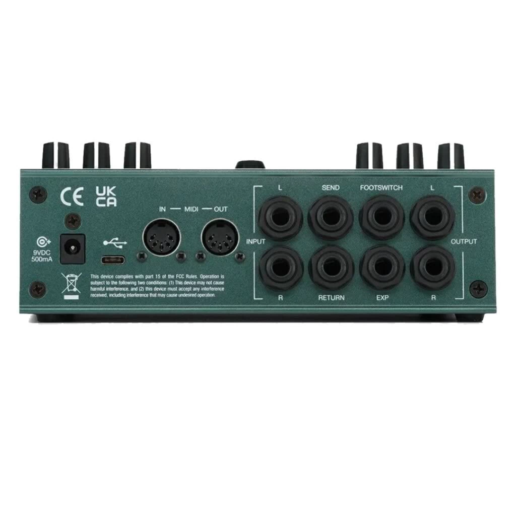 Incluye diez tipos de reverberación —Hall, Room, Spring, Plate, Reverse, Dynamic, Auto-Infinit, Shimmer, Polyphonic y Resonant— junto con módulos adicionales como delay (digital, analógico y cinta), trémolo, chorus, flanger, phaser, EQ gráfico, saturación, bit crusher, volumen y un bucle de efectos externo. Cada motor de reverb es panoramizable, y cada bloque puede colocarse libremente dentro de la ruta de señal para construir configuraciones simples o extremadamente complejas.