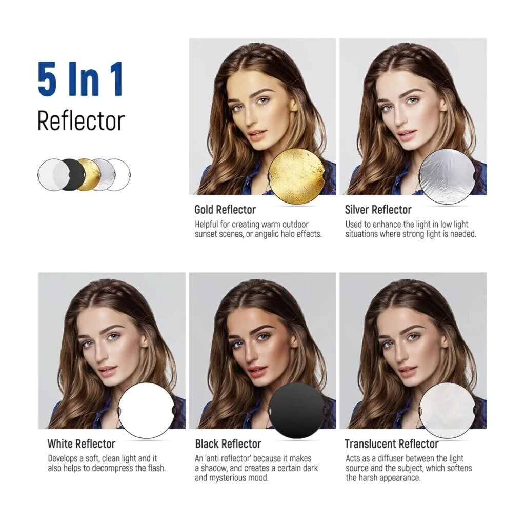 El Neewer 5 en 1 de 30 cm es un reflector de luz plegable profesional diseñado para fotógrafos y videógrafos que buscan control total sobre la iluminación en estudio o exteriores. Su diseño versátil y liviano permite ajustar el tono, la intensidad y la dirección de la luz con facilidad, logrando resultados precisos y naturales en retratos, producto, moda o grabaciones en video.