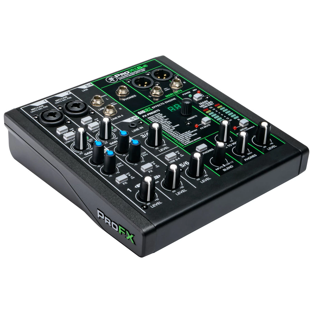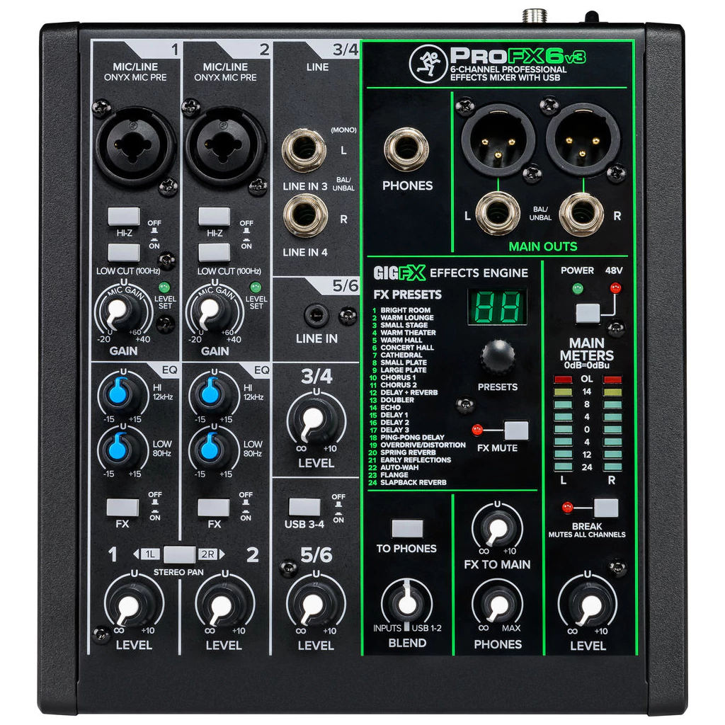 La Mackie ProFX6v3 es una consola de mezclas de 6 canales con dos preamplificadores de micrófono Onyx con 60 dB de margen dinámico y un motor de efectos integrado con 24 efectos, ideal para sonido en vivo, grabación doméstica y creación de contenido. La interfaz de audio USB 2x4 integrada ofrece grabación y reproducción de alta calidad a 24 bits/192 kHz con monitorización sin latencia.
