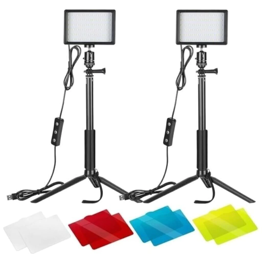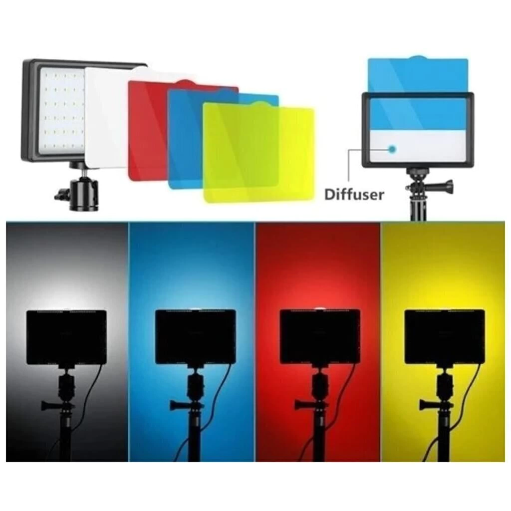 Ambos paneles funcionan mediante alimentación USB, lo que permite utilizarlos con cargadores de teléfono, power banks o adaptadores USB de escritorio. Su diseño compacto y liviano facilita el armado rápido y el transporte. Cada panel incluye cuatro filtros de color (blanco, amarillo, azul y rojo) para ajustar la temperatura y el estilo de la iluminación sin necesidad de postproducción.