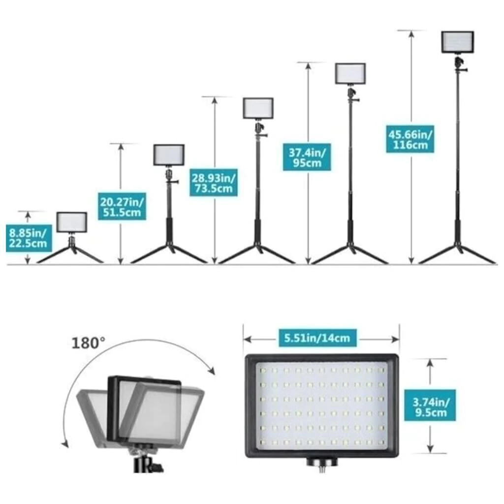 Los trípodes incluidos ofrecen una altura ajustable entre 22 cm y 116 cm, permitiendo configurar desde iluminación baja para escritorio hasta posiciones más altas para retratos o videos.