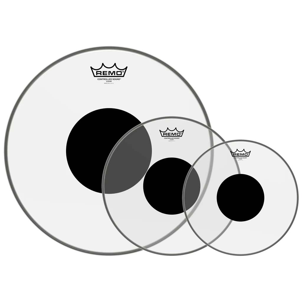 Los parches Controlled Sound® Clear Top Black Dot™ ofrecen tonos medios enfocados con un ataque bien definido. Fabricados con una sola capa de película transparente de 10 milésimas de pulgada y un punto negro superior de 5 milésimas de pulgada, los parches Controlled Sound Clear Black Dot™ proporcionan un ataque y una proyección articulados con mayor durabilidad. La zona exterior del parche ofrece un tono y una sensibilidad mejorados, mientras que el punto negro central aumenta la durabilidad y el control de armónicos.